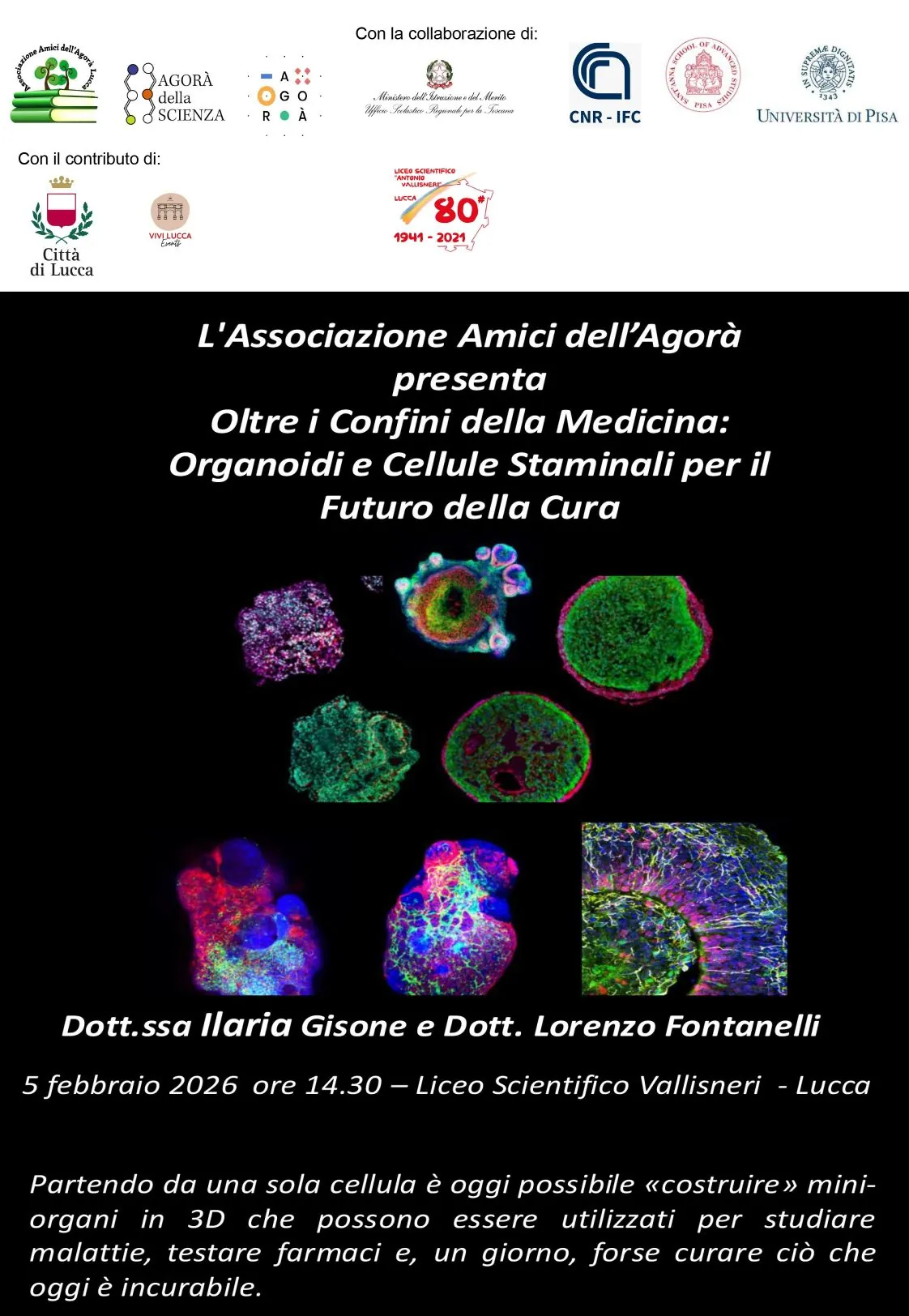 L’Associazione Amici dell’Agorà con il contributo del Liceo Vallisneri e la collaborazione del Comune di Lucca e dell’Ufficio Scolastico Regionale per la Toscana presenta presso la nostra scuola la conferenza: “Organoidi e cellule staminali” tenuta dai relatori il dott. Lorenzo Fontanelli, laureato in medicina, specializzato in Neurologia presso l’Università di Pisa, dottorando presso la Scuola Superiore Sant’Anna di Pisa e la dott.ssa Ilaria Gisone laureata in biologia presso l’Università di Pisa, attualmente post-doc presso l’Istituto di Fisiologia Clinica, CNR, Area della Ricerca di Pisa.